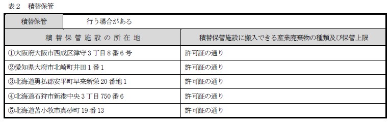 3.乙は、甲から委託された産業廃棄物の積替保管については表2の通りとする。ただし、積替保管を行う場合は、乙は甲に対して、事前に通知を行うものとする。積替保管は法令に基づきかつ、委託契約書で定める契約期間内に確実に収集・運搬できる範囲で行う。この場合、安定型産業廃棄物は、他の安定型産業廃棄物と混合することがあり得るものとする。また、積替保管の場所において手選別を行うことがあり得るものとする。